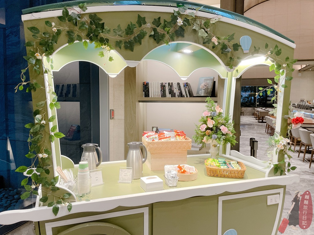 座位區的後面有一台可愛的小餐車,上面放著迎賓飲料跟小點心唷~