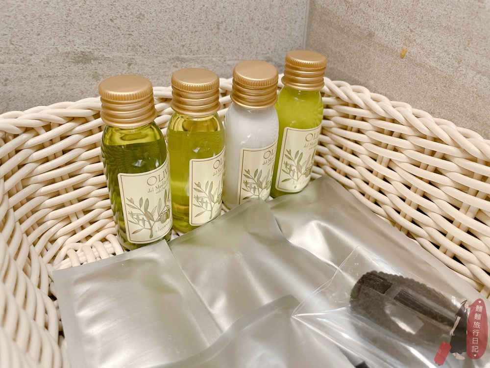 檯面上放著盥洗備品,沐浴品牌是使用OLIVA地中還橄欖系列!