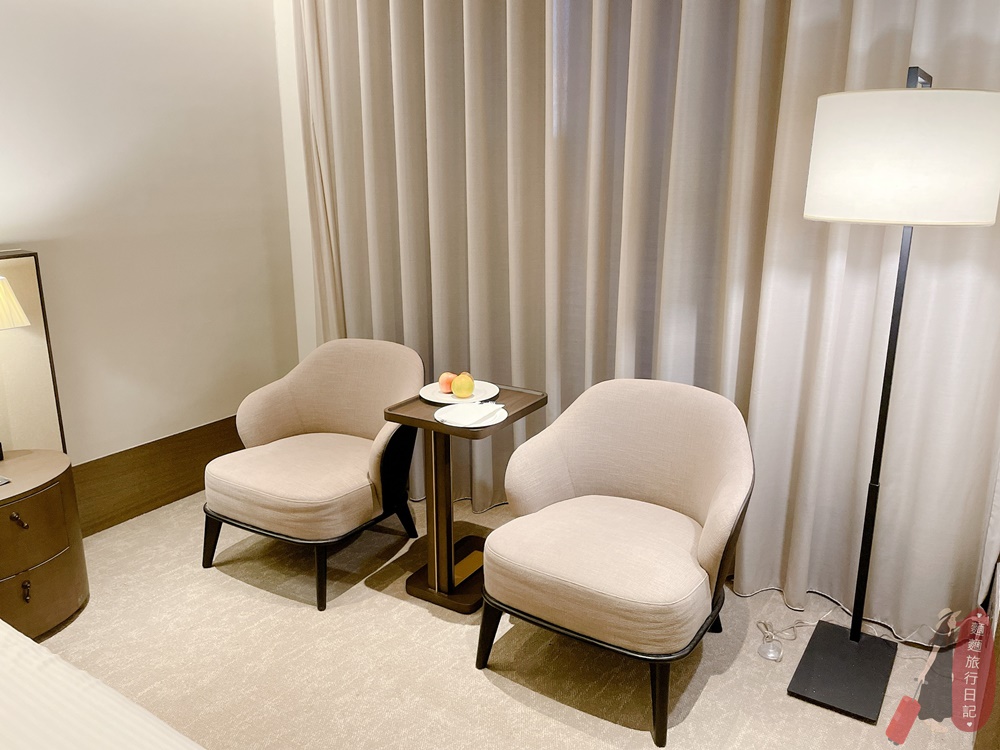 房間的窗邊有沙發桌椅,桌上擺著迎賓水果,最近村長住酒店的新興趣就是狂叫外送,我們只在台中待一天,晚上我們沒有出去外面吃飯,我直接在酒店叫了6間不同的熊貓外送(超爽),酒店服務真的超好,門房都會幫忙領餐等全部到了之後我才一次下去拿!