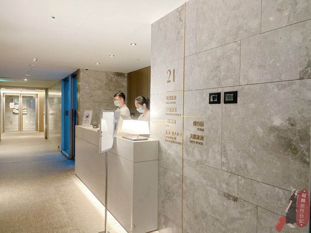 順天環匯酒店的公共設施集中在頂樓21樓,有健身房、泳池跟SPA,電梯一出來就有服務人員在櫃檯等你囉!