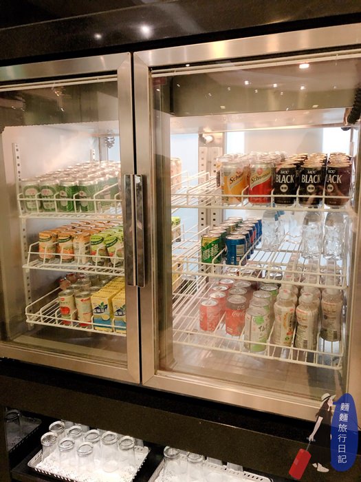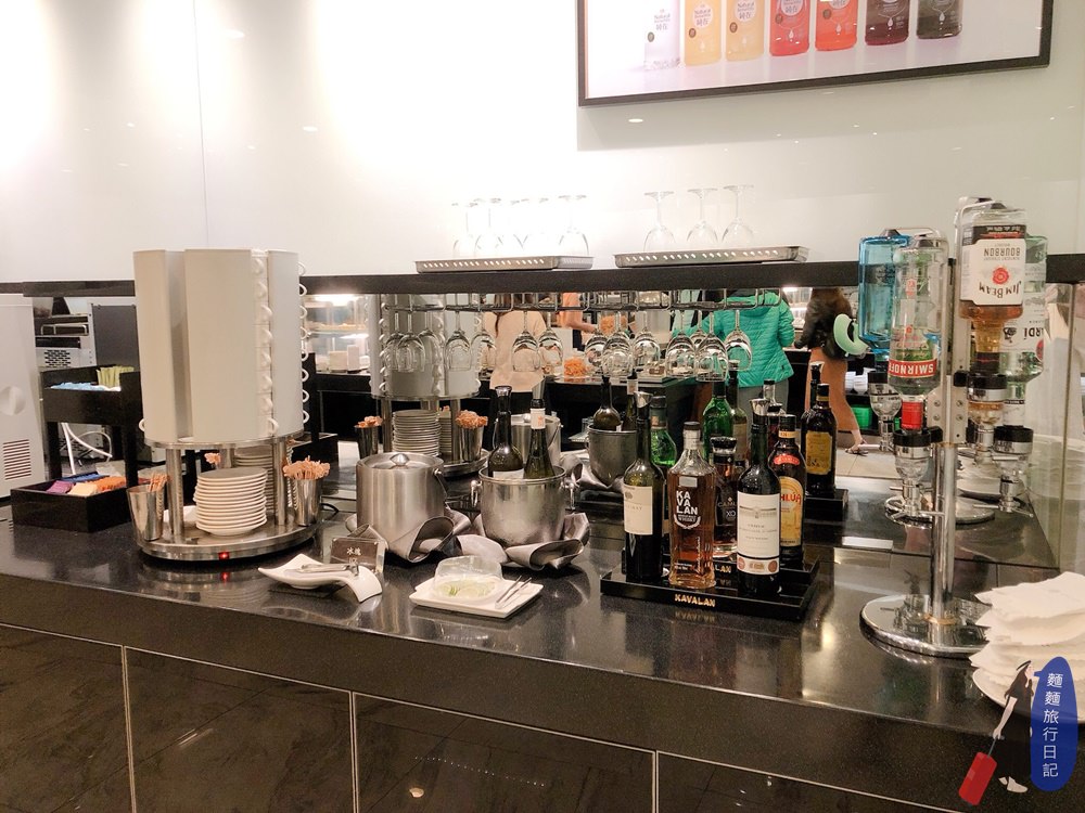 酒櫃琳瑯滿目,可以自己調酒來喝,但我每次都覺得不解,搭飛機是一件不太舒服的事吧?在搭機前還喝酒不是更不舒服嗎哈哈哈!!只能說我這個半杯倒的人沒資格批評。