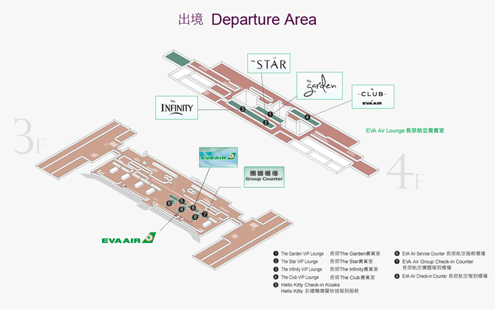 - The Garden:長榮最高等級貴賓室,長榮鑽石卡會員、美國運通黑卡、以及美國運通長榮航空簽帳白金卡、國泰世華長榮航空極致無限卡搭乘商務艙/桂冠艙/皇璽桂冠艙乘客可使用。