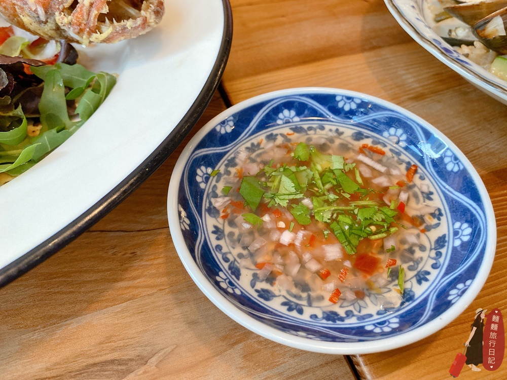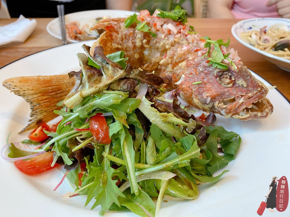 無肉不歡點了一隻魚,這道泰滴醋溜現撈魚仔,把魚炸的金黃酥脆,整隻立起來在盤子上,旁邊一樣是生菜沙拉。