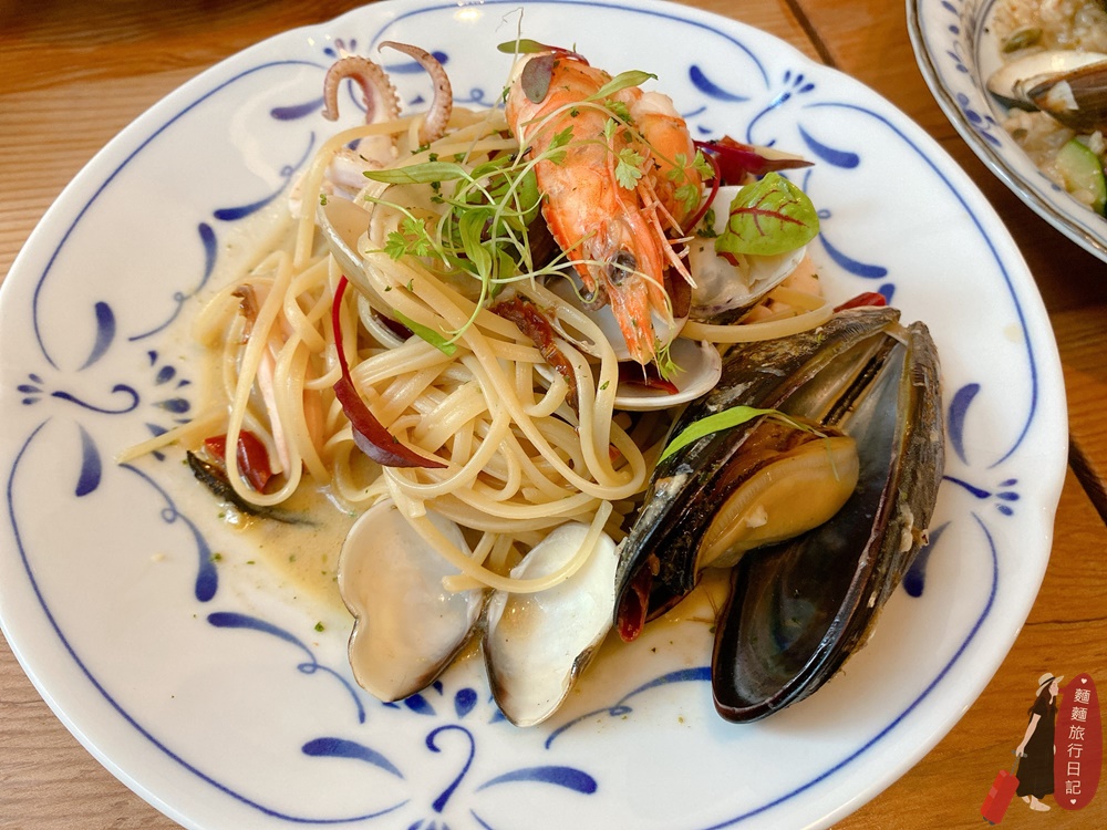 粗飽飽就是主食系列啦有飯有麵,我們點了一份白酒蛤蠣海鮮細扁麵,這海鮮的份量也太多了吧!海鮮很新鮮好吃,白酒類的義大利麵吃起來清爽無負擔又好吃!