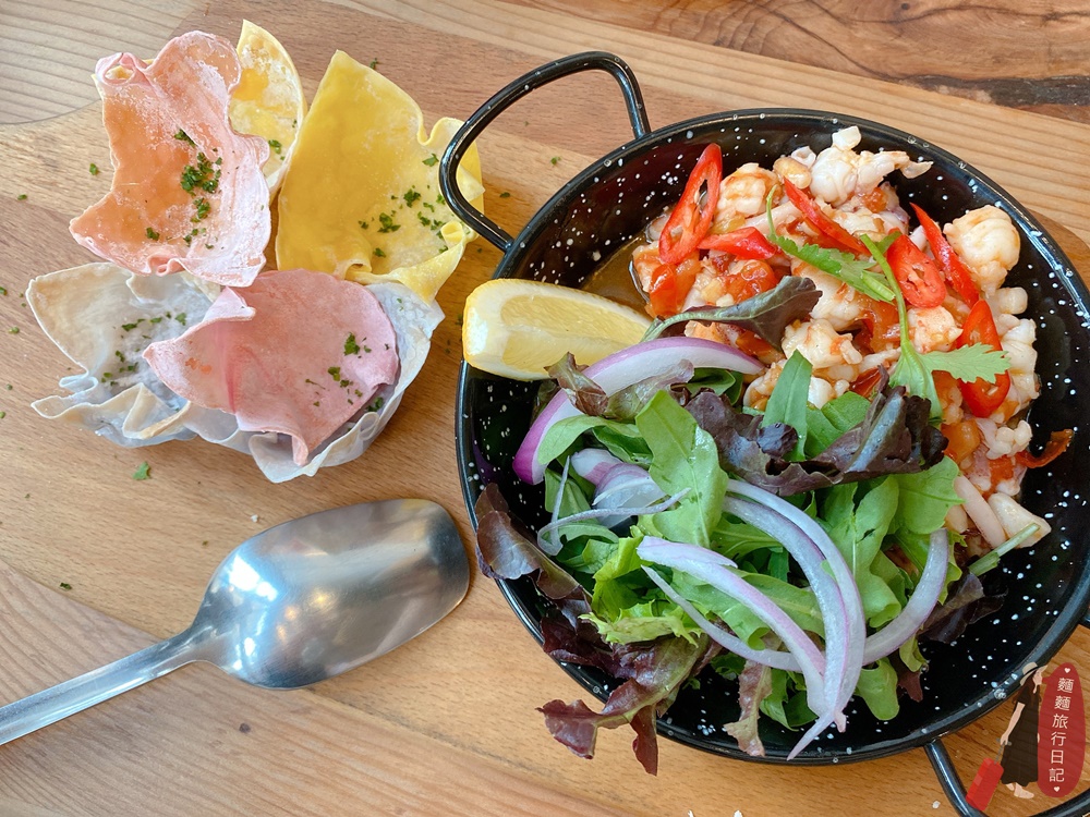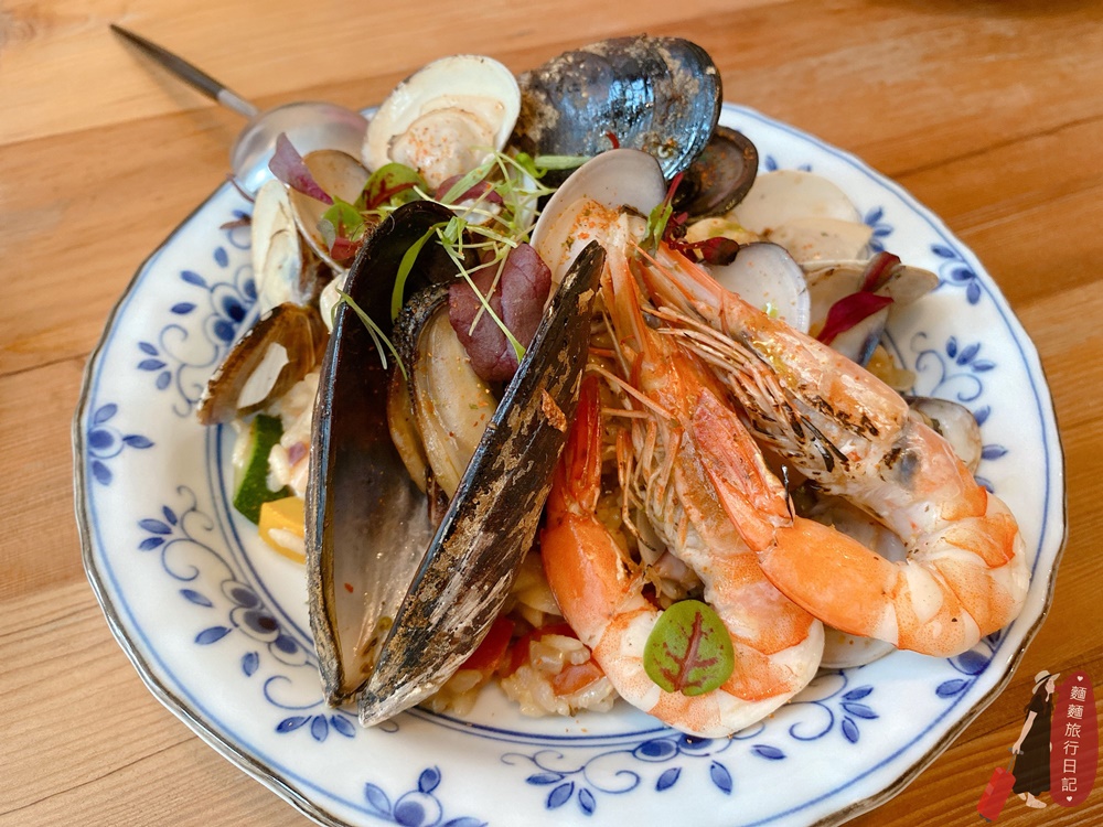 粗飽飽可以選兩樣,所以我們還點了名字聽起來很厲害的漁夫海鮮燉飯,又是滿滿的海味呀!這盤更扯,海鮮直接蓋住主食米飯,料滿到看不到底下的燉飯呀!蝦子感覺是用烤的,蝦頭上有烤焦的痕跡,海鮮非常新鮮,滿滿的海味都被米飯吸的飽飽飽,喜歡吃飯的必點,一口吃進去滿滿的大海味!