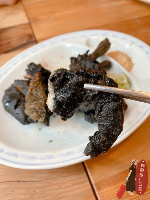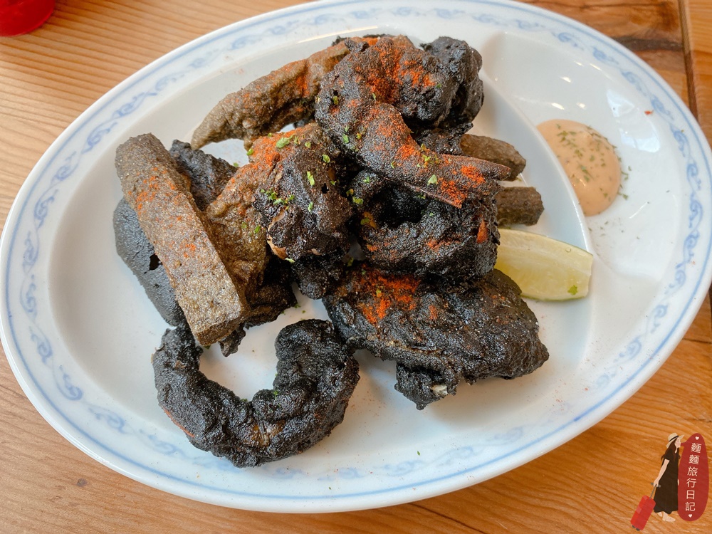 老饕特選我們選了布雷克炸海鮮,欸欸欸不要看他長的黑嚕嚕好像不是很好吃,這道必點,非常好吃啊!大家點起來點起來~~~裡面有透抽、海鱸魚、鮮蝦、墨魚甜不辣,這些海鮮裹上的墨魚汁下去炸,炸得非常酥脆!咬下去一不小心還會被海鮮噴汁燙到,雖然黑成一團看不來自己夾到的是什麼,但是吃進嘴裡意外的驚喜感十足,旁邊一樣有附上檸檬可以擠~