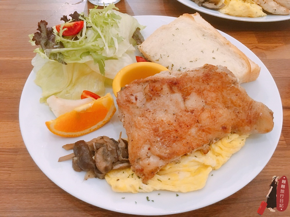 我點的這份早午餐有生菜沙拉、水果、一片麵包對切、綜合野菇、義式雞腿排,雞腿排下面是歐姆蛋捲,蛋捲裡面有包一些菇類,還可以選要薯條還是薯餅,我選的是薯餅,被蓋在雞腿下面了~
