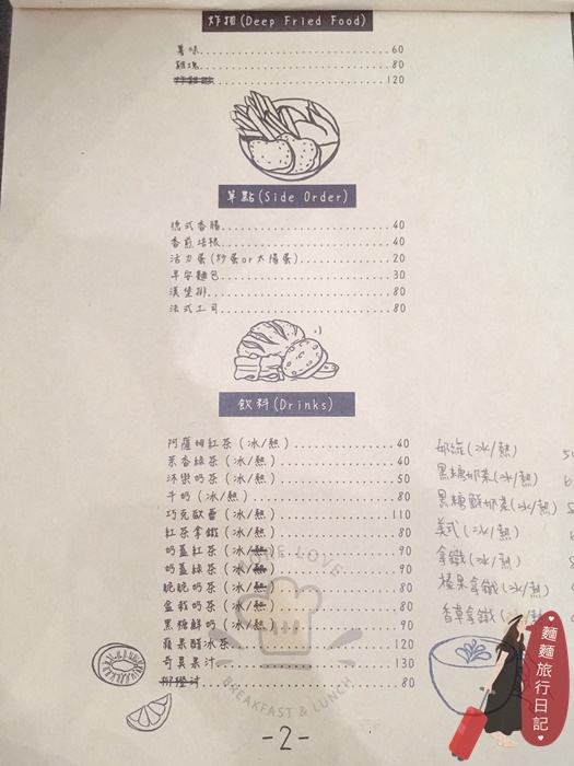 也有炸物、單點的小東西、飲料,除了炸物跟單點小品外,點早午餐、漢堡、三明治、義大利麵、燉飯都有附一杯紅茶,飲料升級的話可以補20塊~