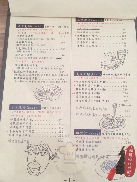 菜單有早午餐、手工漢堡、三明治、義大利麵跟燉飯,以早午餐來說我覺得價錢有點貴啦😆