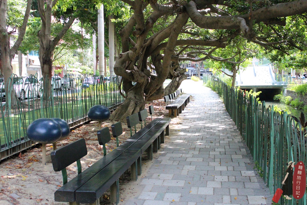 河水前面有像是綠色草狀的鐵欄杆圍住,非常安全,不用怕小孩在奔跑追逐玩樂的時候跌到水裡 😅,樹下的椅子也很適合爸媽乘涼看小孩用啊!