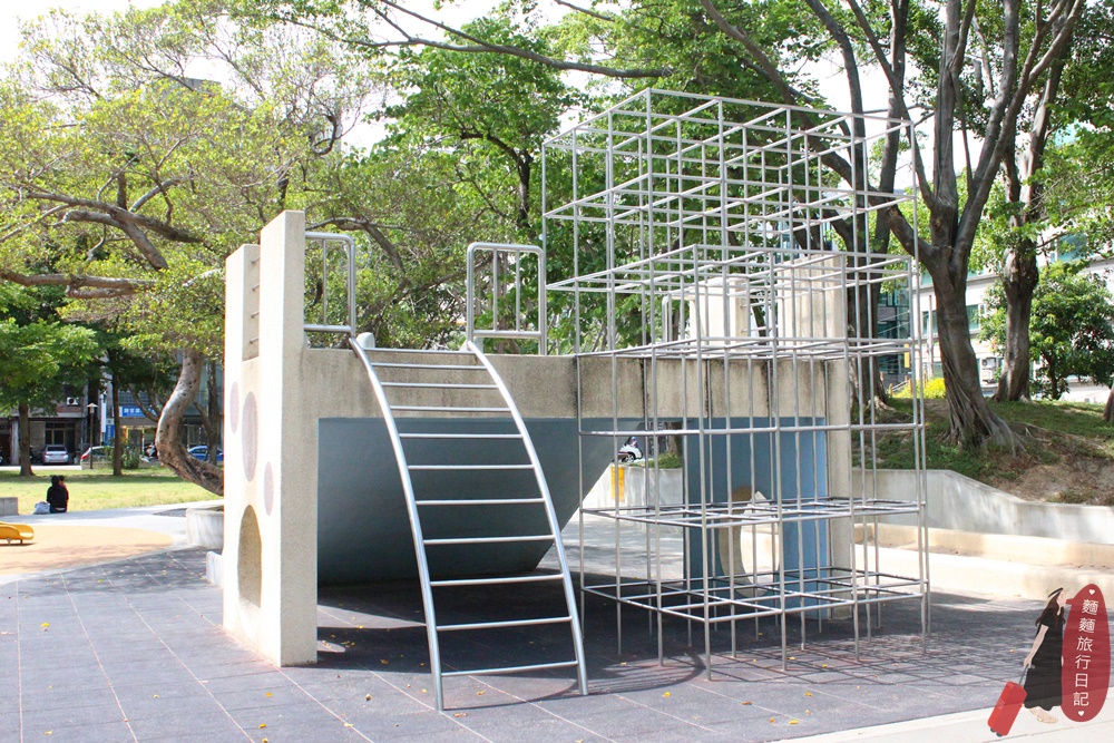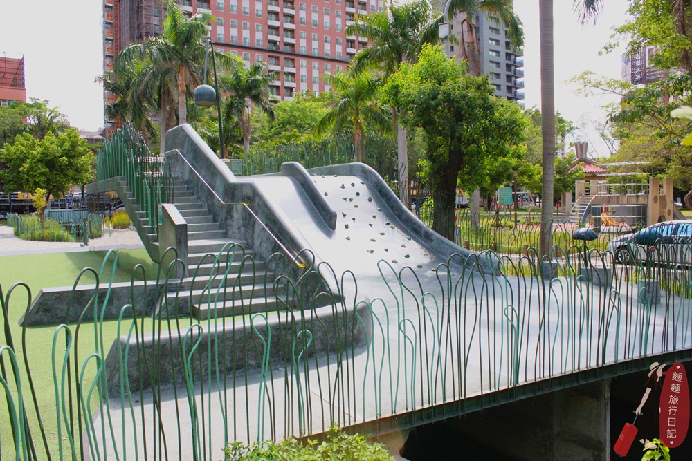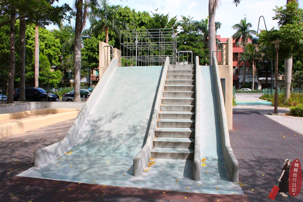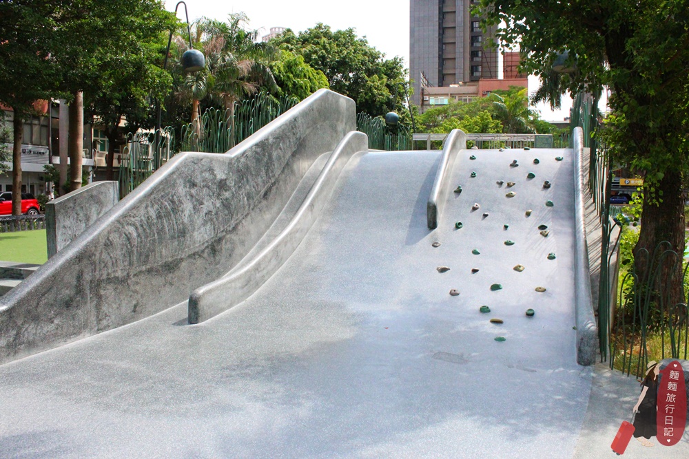 中央公園裡的磨石溜滑梯背面也是爬格子的設計唷!小孩超愛爬爬爬、鑽鑽鑽的~爬上去會很有成就感,努力後就可以享受滑梯的速度感啦!