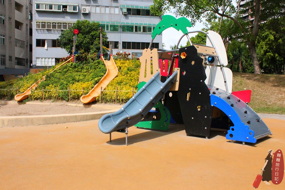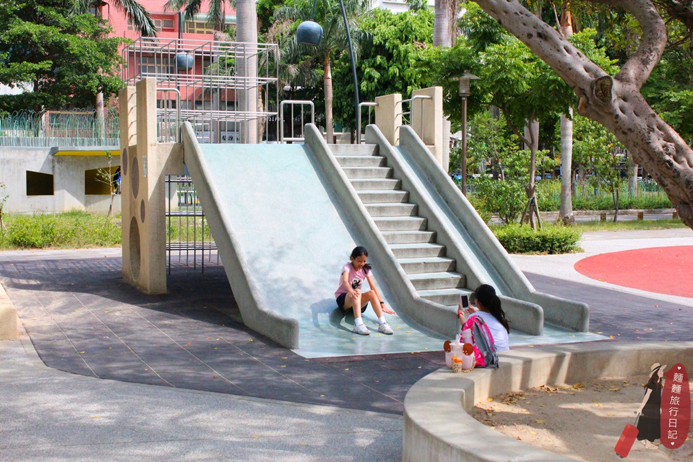 公園裡有一個小的磨石溜滑梯,這裡就比較適合小朋友啦~磨石溜滑梯深受大朋友跟小朋友的喜愛是因為速度真的超、級、快!