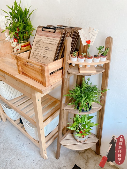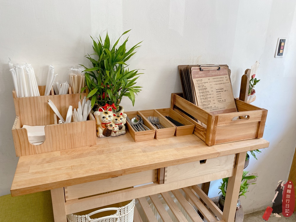 玄關處就是張木桌,暮牧MUMU早午餐不收取服務費,菜單、內用、外帶餐具、紙巾都在木桌上,請自取喔~