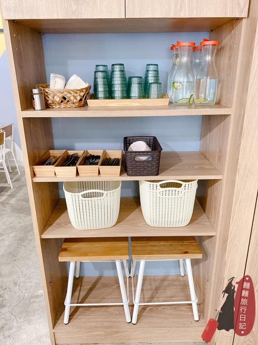 後方的座位區一樣有自助式區,有水、餐具、紙巾。