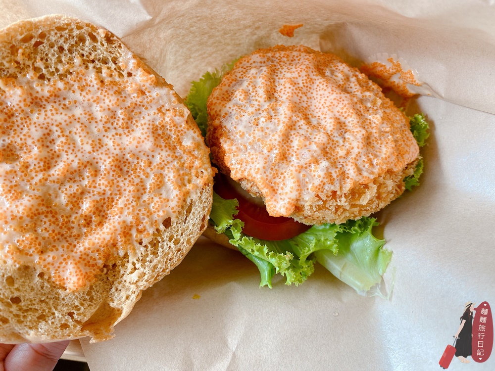 更絕的是,店家用料超級實在,漢堡上面淋滿明太子沙拉醬,一粒粒的明太子多到有密集恐懼症的人不要看蛤~明太子可樂餅堡超推👍,建議店家可以再多淋芥末醬會更出色,更讓人意猶未盡!