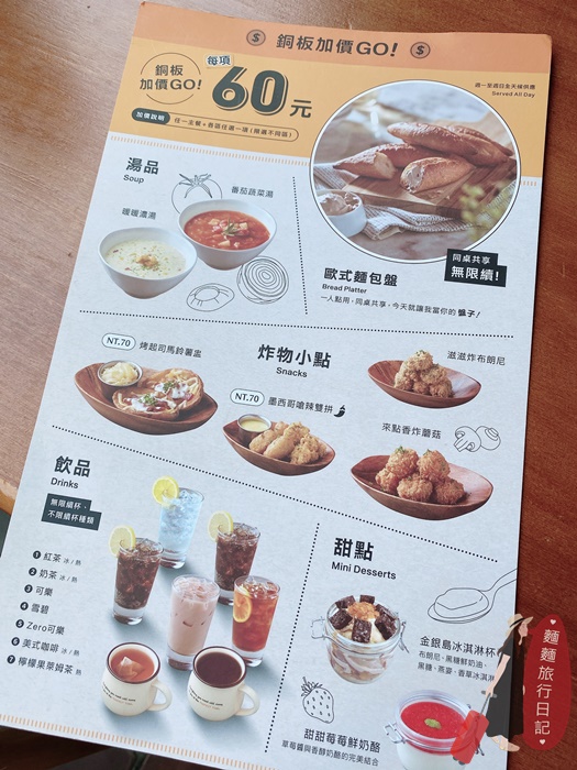 就算一個人來也不用怕,還有銅板60元加價購,凡是點主餐,每項+60就可以各區任選一項。