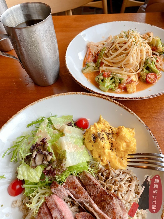 新竹必吃美食貳樓餐廳 Second Floor Cafe,新竹店的餐廳空間很寬敞舒適,有1樓跟2樓,非常多座位,很適合多人、家庭聚餐,另外餐廳也是少數的寵物友善餐廳,可以帶小屁孩來之外,也可以帶毛小孩一起來,菜單厚厚一本,從開胃菜、早午餐、漢堡三明治到義大利麵、米飯、甜點應有盡有,平日午餐還有推出超值優惠的商業午餐,大猴那盤曙光汁鮮蝦雞肉細扁麵真的很好吃!相對村長點的低碳-炭烤牛排奶油花椰菜飯再搭配無糖紅茶,真的很健康啊😫哭😭,大家來貳樓就不要管減肥了,想吃的點起來~看起來好吃的點起來啊!