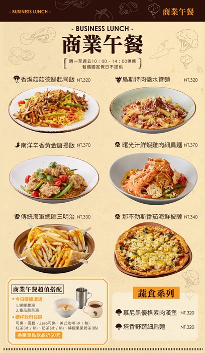 貳樓也有推出商業午餐,只有周一至周五早上10點到下午兩點供應,假日沒有蛤~商業午餐的附餐有暖暖濃湯跟續杯飲料任選,滿划算的。