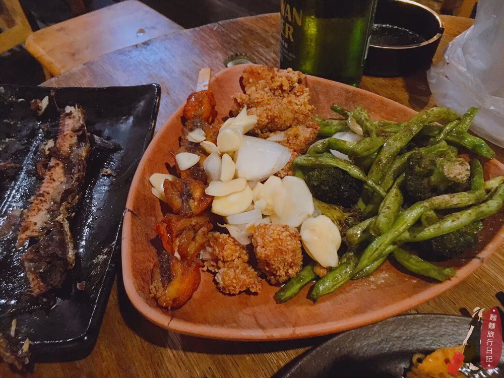 這一盤是鹽酥雞,他們家鹽酥雞太晚來的話很常賣完啊!我已經摃龜3次了,這次終於被我吃到啦~~~炸物會放上蒜片跟洋蔥片,搭配在一起吃就是爽啊!在竹北想吃宵夜就來車庫鹽酥雞,想吃炸的烤的炒泡麵熱炒功夫菜喝個熱湯,這裡應有盡有,是我在竹北最愛的宵夜場了,唯一的缺點就是人真的太多啦~要等超久,不想等的人可以先打電話點餐!