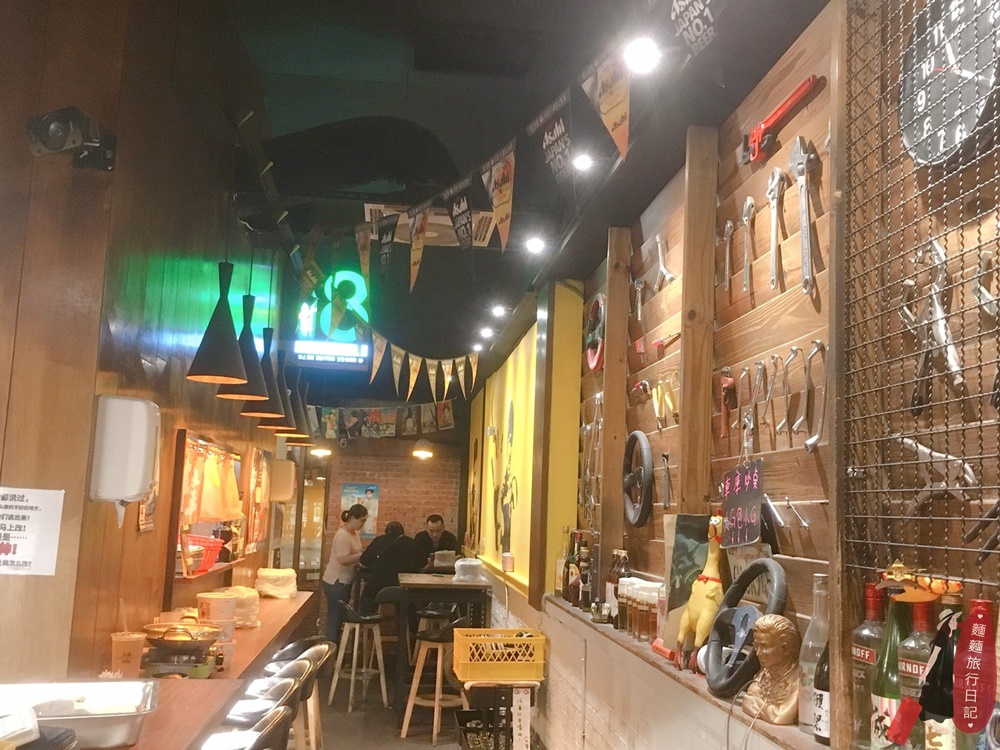 車庫鹽酥雞室有內用坐位區的,文興店的裝潢一整個很活潑欸!牆上用鐵網與滿滿的工具排列,工業風格。
