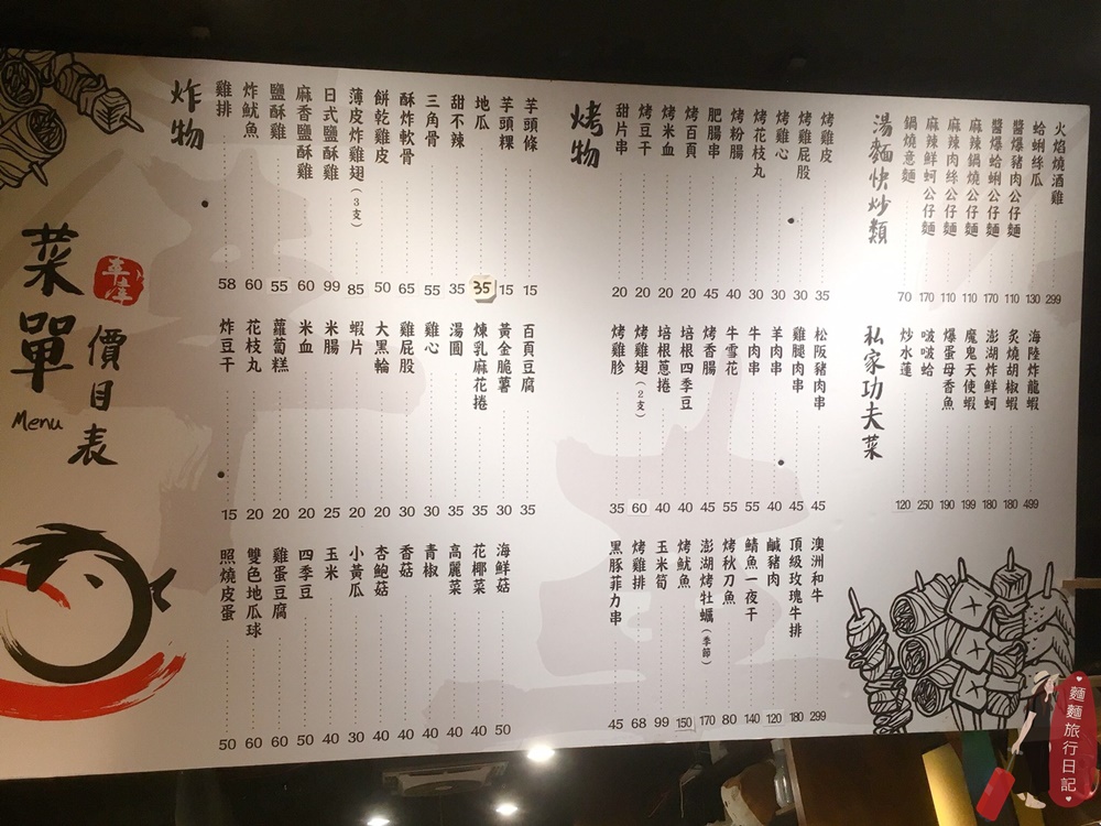 雖然是店名叫車庫鹽酥雞,但招牌上有小小的三個字寫 不、只、是、所以還有很多不同的品項唷!串燒、烤物、功夫菜、炒公仔麵、湯品等,冰櫃上方都有清楚的價目表,真的不知道那是什麼也可以直接詢問店員,店員人很好都會跟你解釋啦~