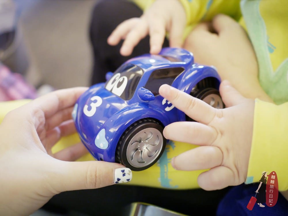 阿帶波仔上飛機呀!!我準備了兩個法寶~一是他愛吃的米餅、二就是他愛的玩具!!! (出發前幾天特地跑去俏媽咪噴了新車車咧)