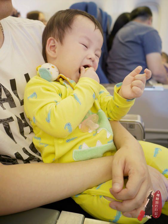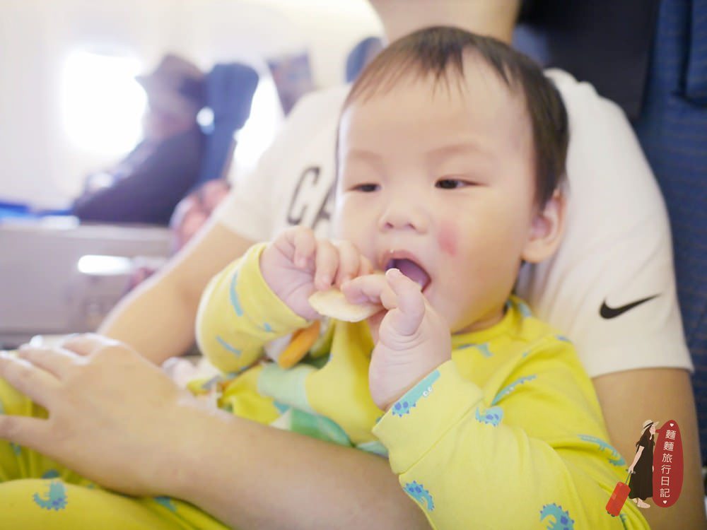 他就這樣坐在大猴的腿上,爺般地狂嗑著他的米餅,算是很乖很乖地度過這趟旅程但我原本有做好功課,大部分媽咪都說上機前不要讓寶寶睡,起飛跟降落的時候再讓他睡or吃小餅乾跟喝奶(為了舒緩寶寶因為壓力而耳朵痛),But…..根本就沒那麼簡單阿,波仔當天超早就起床了,都沒睡喔!!!!!!!!!結果到了飛機上可能因為環境太特殊了整個人超興奮阿
