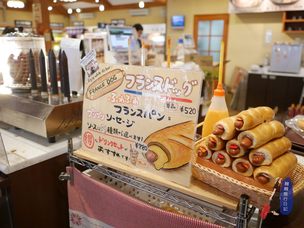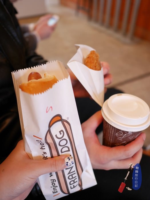 等待的時候旁邊剛好有美食販賣部!所以我就很嘴饞地買了這個熱狗堡吃  沒想到味道還很不錯(我點的是莎莎醬口味的),順便點了套餐這樣就有熱呼呼的咖啡可以取暖,從東京來到河口湖覺得氣溫驟降欸!!!!