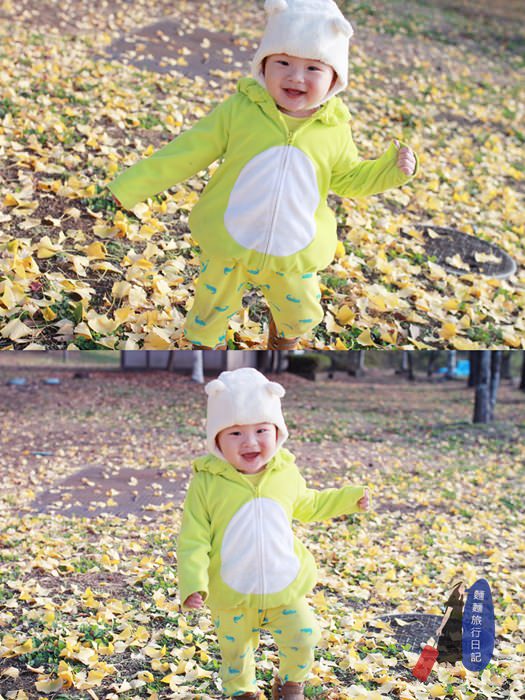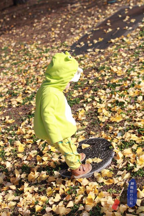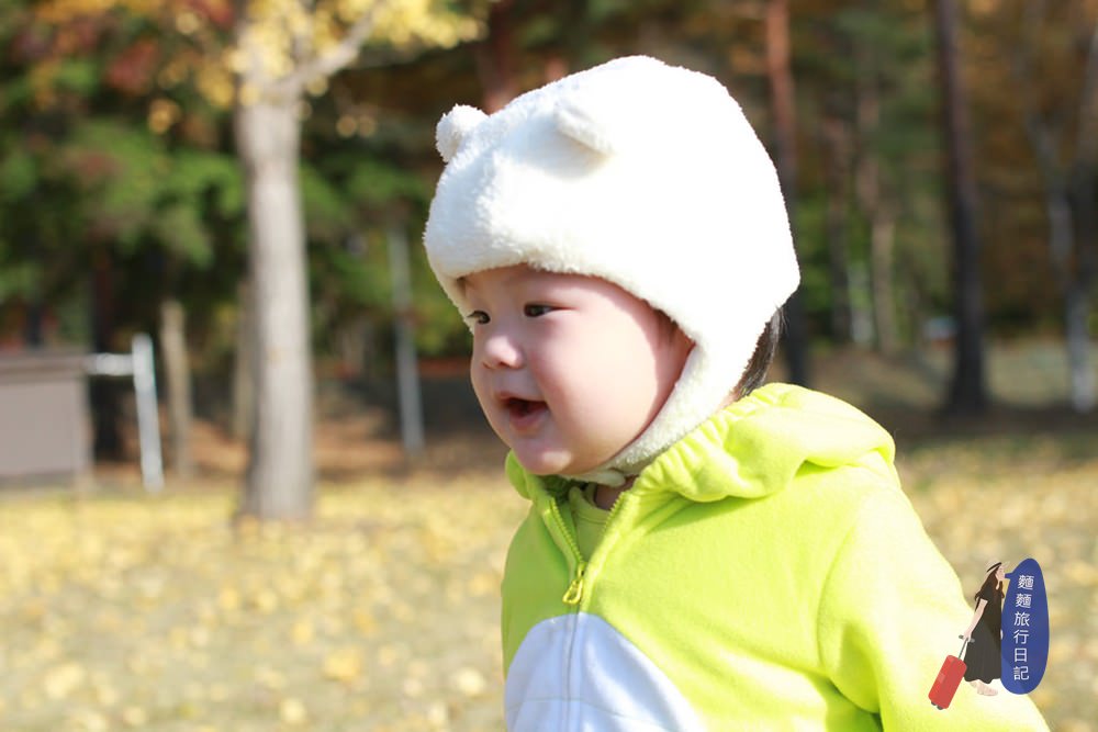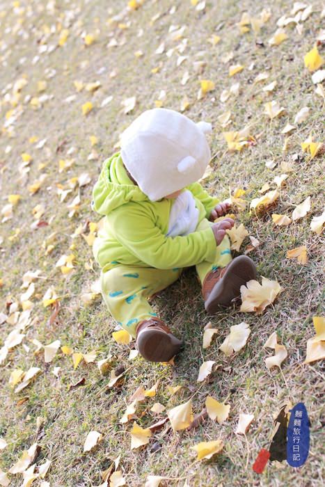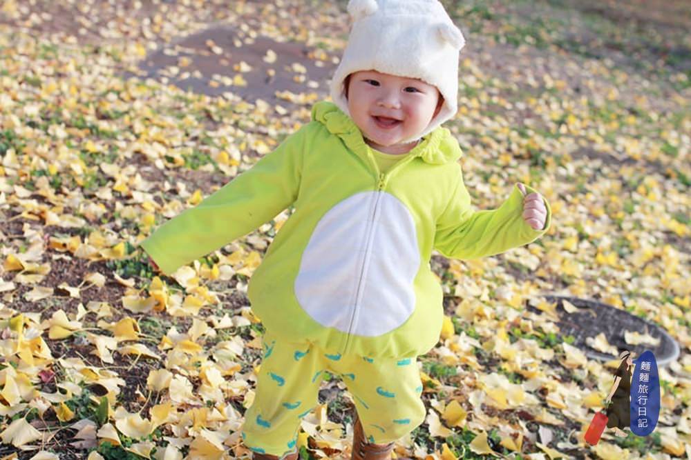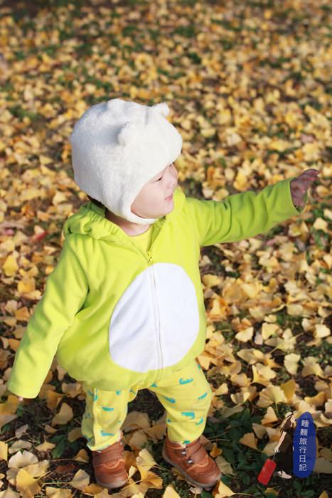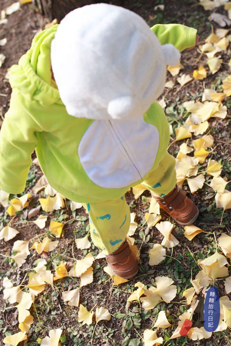 就這樣~我們慢慢推著波仔沿著湖邊的步道走,這景色完全不輸我跟大猴學生時期一起去浪跡天涯的紐西蘭啊!而且走著走著在路邊發現了銀杏樹步道,剛好這時波仔醒了,我就提議讓他下來跑一跑(那裡剛好有很大的公園)