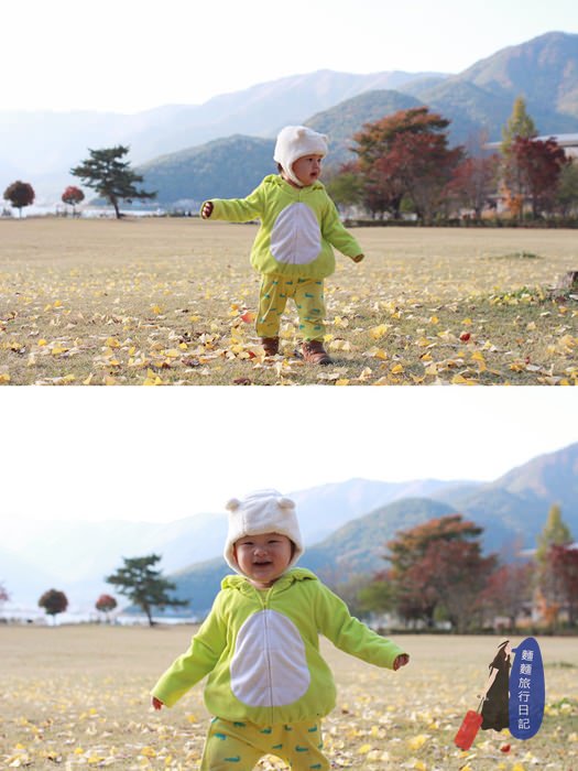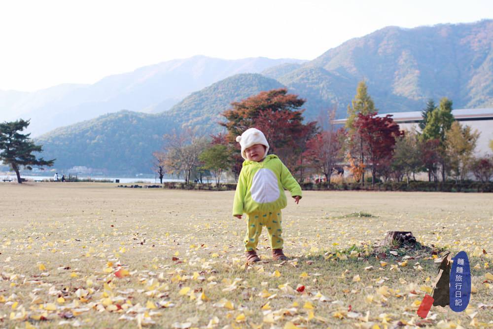 我們大概又在這個河口湖美麗的角落逗留了半個小時才離開,走的時候波仔已經弄得全身髒兮兮的  因為他又跑又跳,在地上坐著、爬著跟亂滾把我買的可愛三眼怪外套弄得超悲劇XD還好家裡是大猴負責洗衣(拍拍)