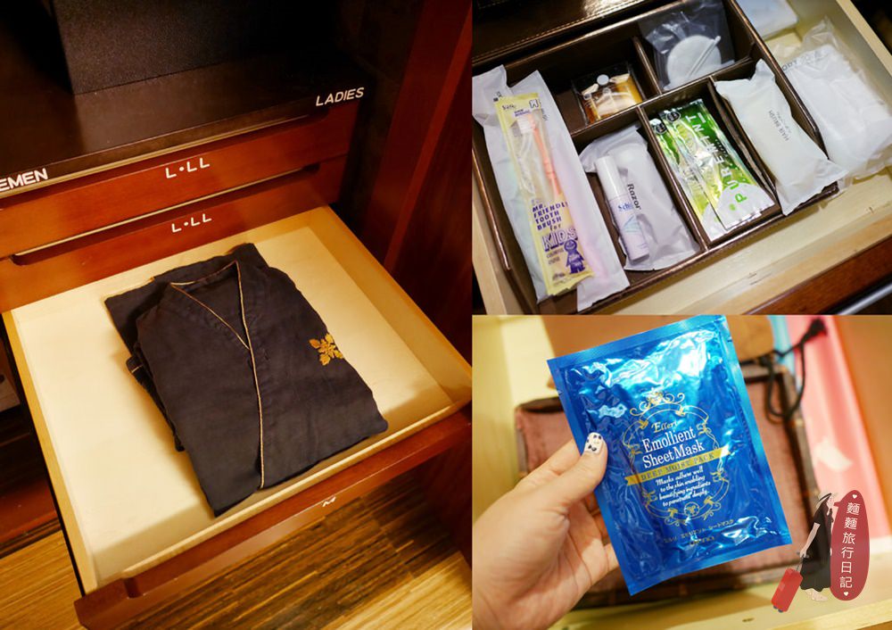 KUKUNA非常貼心的提供了浴衣可以讓旅客在館內穿,不管是要穿去澡堂泡湯還是去餐廳用餐都OK,而且竟然還有超多尺寸可以挑選 你說酷不酷?!再加上備品竟然有面膜跟刮鬍泡,我真的是覺得阿本仔的細心整個無所不在喔!