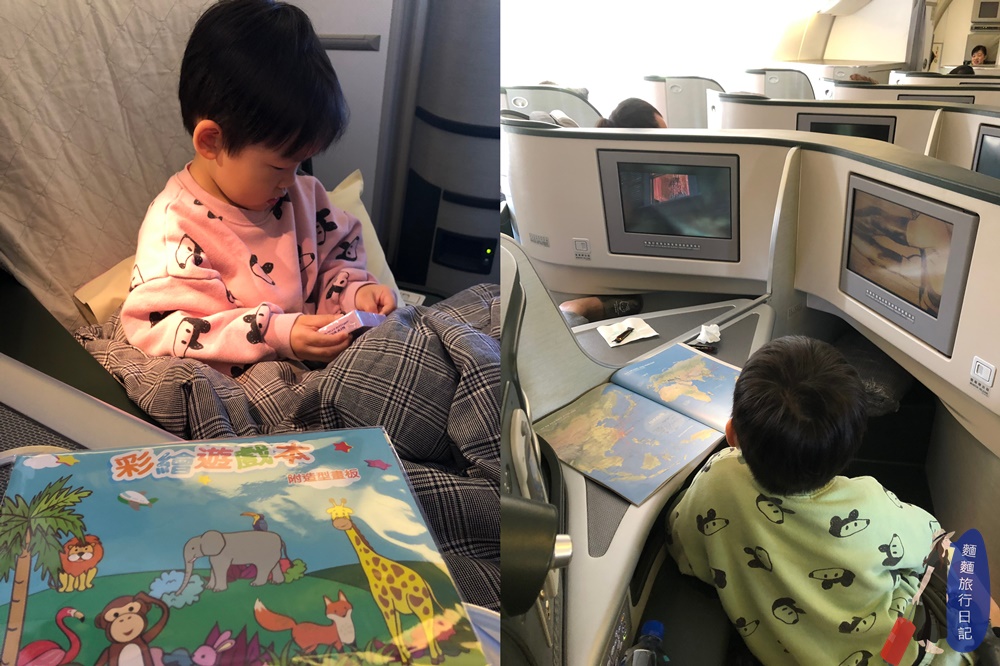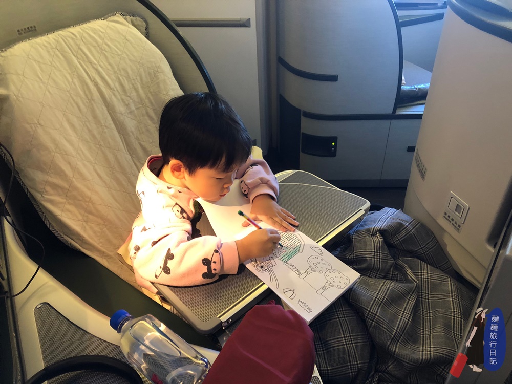 吃完午餐後的悠閒時間,飛機上提供繪本、塗顏色的那種遊戲本等,讓這兩隻除了看動畫片以外,還有其他事情做可以打發時間。