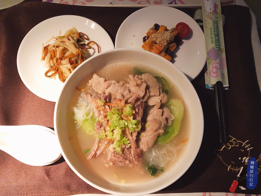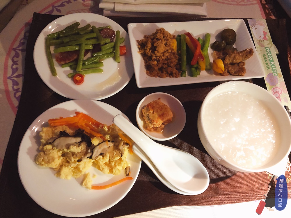 隔天早餐選了清粥小菜,在飛機上居然可以吃到熱騰騰的白粥真是太感動了,還有土豆麵筋、脆瓜、豆腐乳跟肉鬆,炒蛋跟炒時蔬!