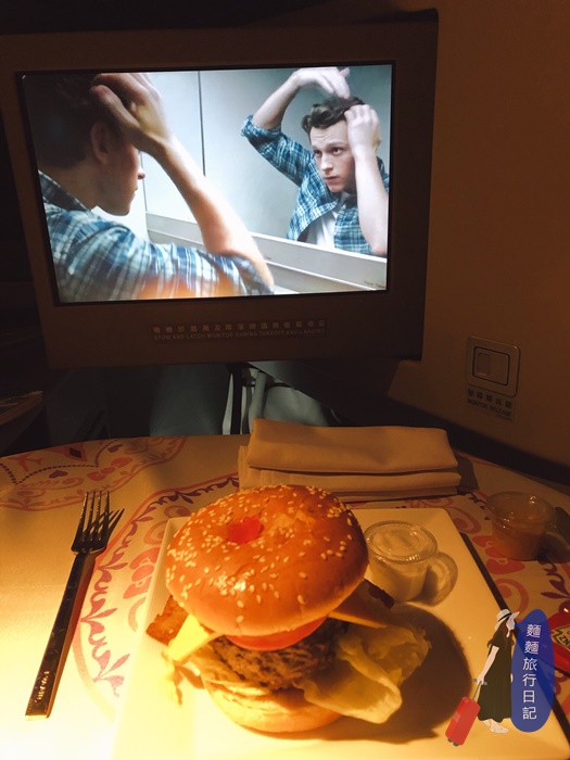 因為我們是搭下午的班機所以上機之後其實我們是先睡了一覺然後起來用晚餐,吃完晚餐我就開始看電影!晃啊晃的又不知不覺過了幾個小時已經是全部的人都在睡覺的時候呢!聽說這種時候就是必吃個宵夜啊~所以村長就點了個牛肉漢堡!邊享用邊看劇!
