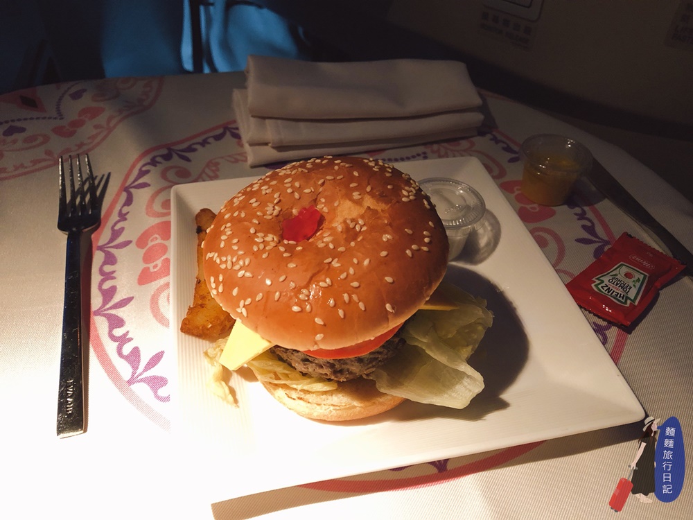 看得太認真,吃漢堡的時候嚇到,很好吃欸!根本不像在吃飛機餐!這個漢堡皮還比麥當勞的好吃很多,肉也超厚料也大方。