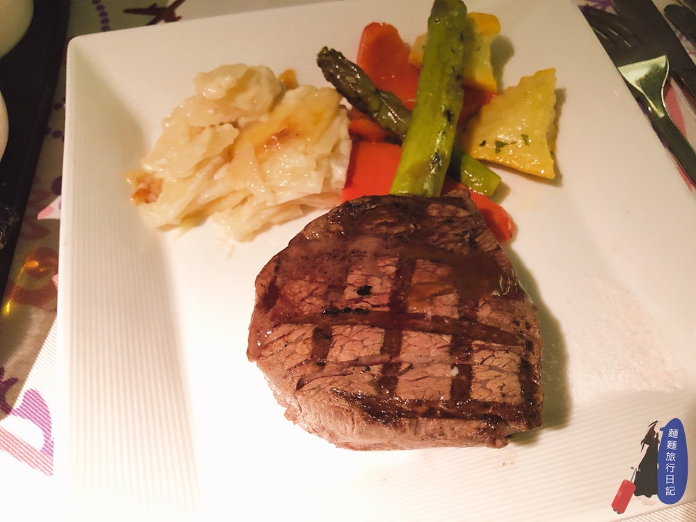 主餐是排餐喔!炙烤美國菲力牛排,可以選醬料還是海鹽,吃牛排我還是喜歡沾簡單的鹽巴吃牛肉的原味!旁邊搭配時蔬跟馬鈴薯千層,牛肉肉質還不錯唷~