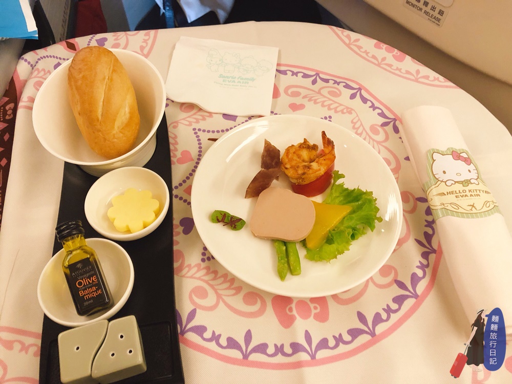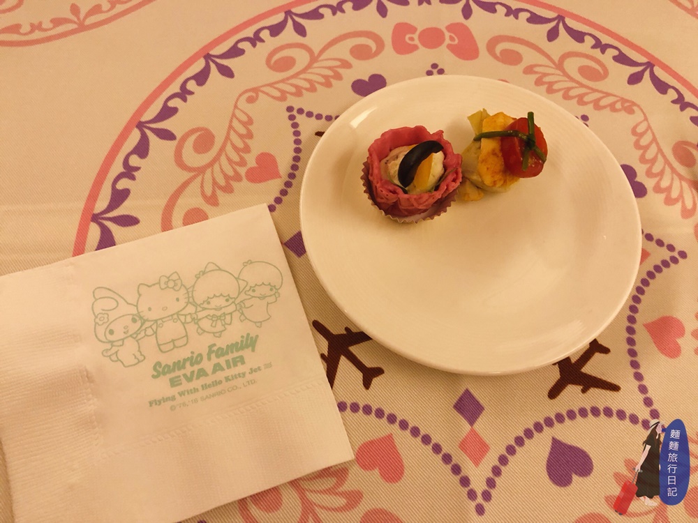 我點的是西式套餐, HELLO KITTY 班機的用餐桌布也是特別跟三麗鷗聯名設計,以波西米雅風格圖騰搭配Hello Kitty 經典色系設計,第一道是餐前小點心,大蒜乳酪蜜桃蘇塔、新鮮薊心拷雞巧點~