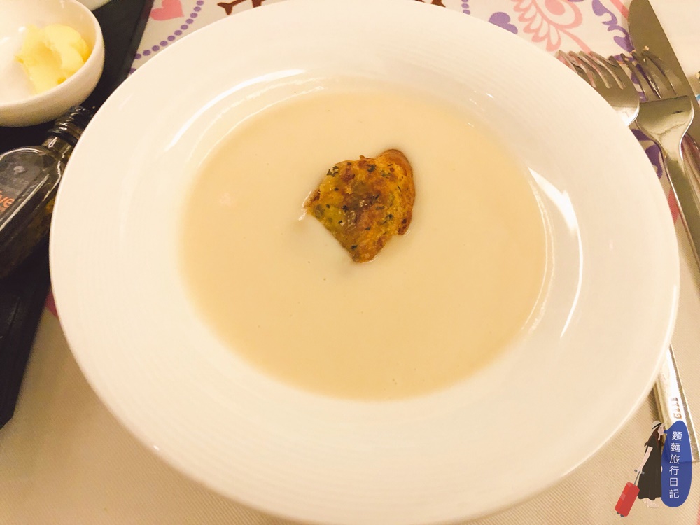 濃湯不是一般的南瓜濃湯或是玉米濃湯,而是奶油白花油菜濃湯喔~上面放的那塊麵包是香草起司麵包,搭配濃湯一起吃!