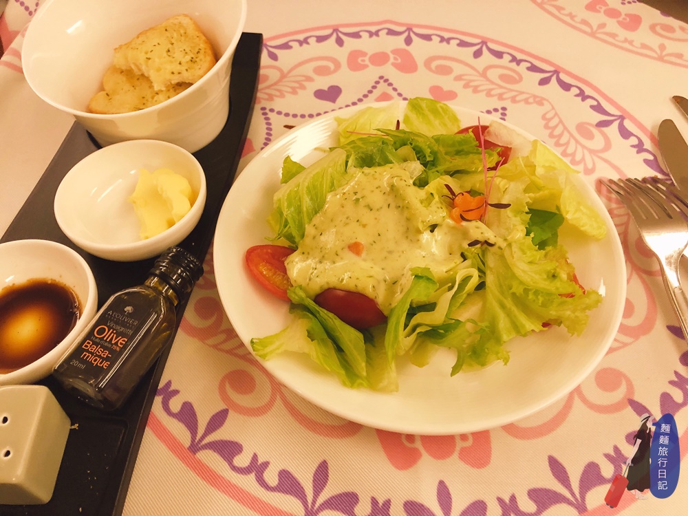 這是餐前麵包有奶油、橄欖油、油醋醬可以隨自己喜好沾麵包吃,居然是這樣一小罐的欸!很可愛,麵包跟奶油已被我摧殘吃下肚啦。