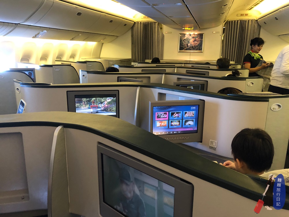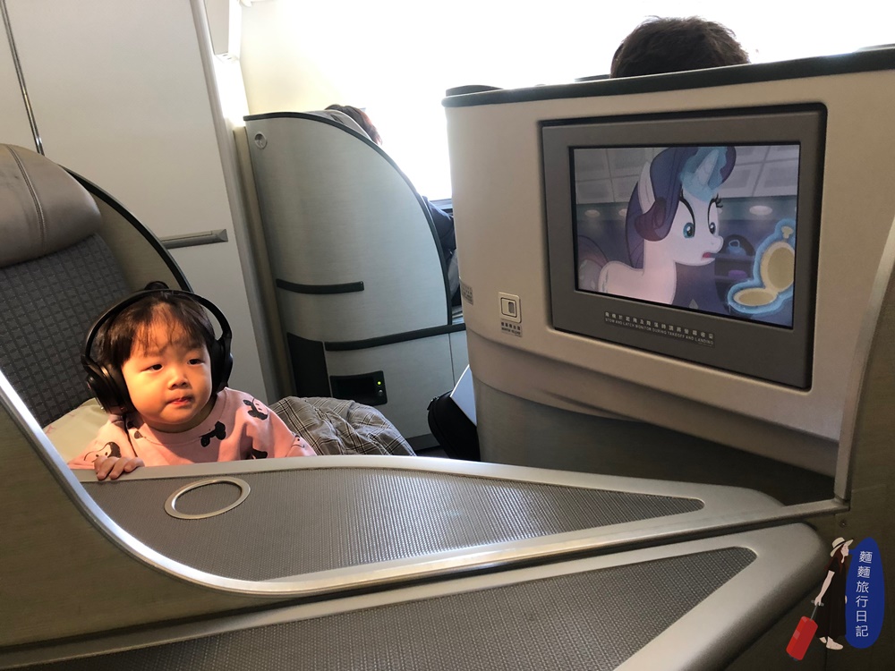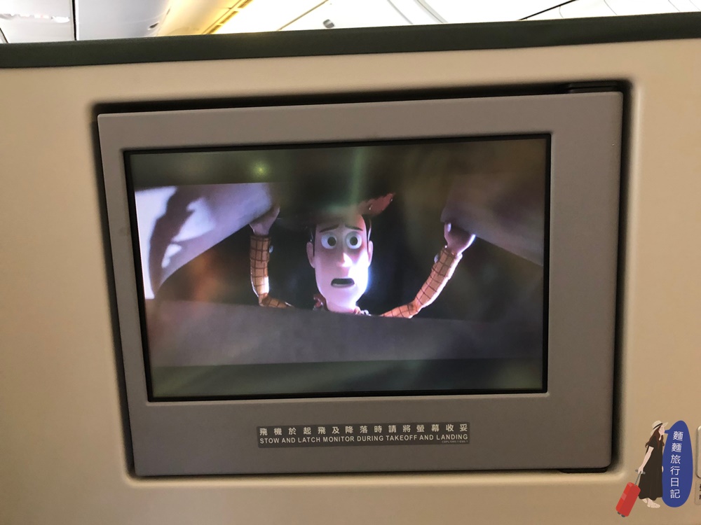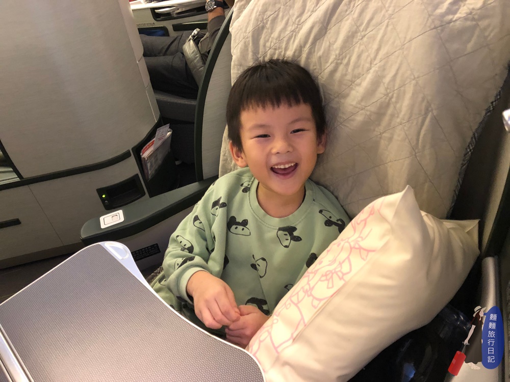 而且因為長途飛行需睡眠過夜需求,每張座椅都可以180度全平躺,非常舒適!如果你要睡覺的話空服員會幫你鋪床喔!就是我背後那條棉被啦