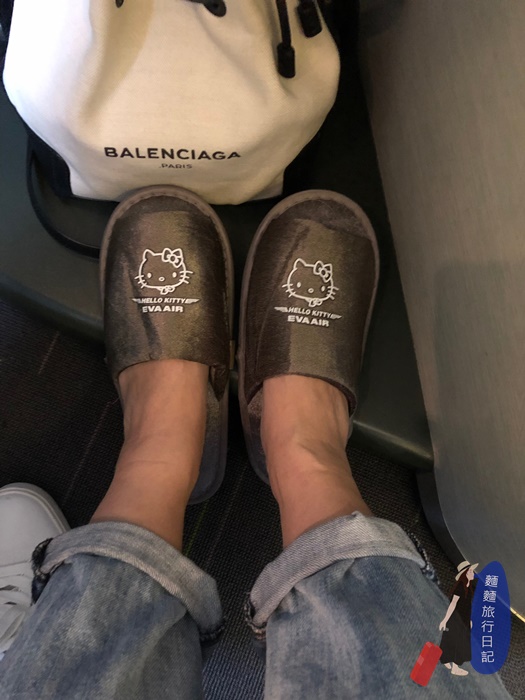 還有室內拖鞋,因為搭到了HELLO KITTY班機,所以有凱蒂貓的圖案!順便說腳下空間非常足夠,村長我很高很大一隻,腳下能讓我舒服伸展外,還可以放包放我的鞋!