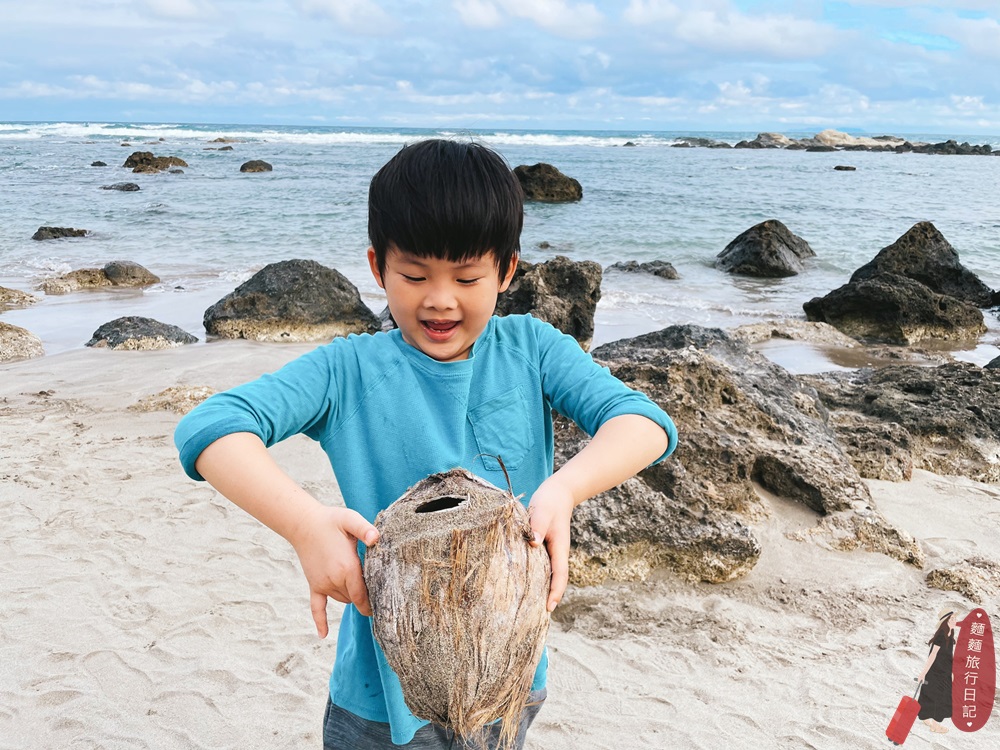 富山護漁保護區有兩大區,一區是沙灘區、另外一區則是珊瑚礁潮間帶區,孩子們在沙灘上玩的超級開心,波仔還撿到一顆超大的椰子殼!孩子撿椰子殼幹嘛啦~XDD