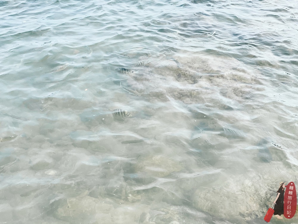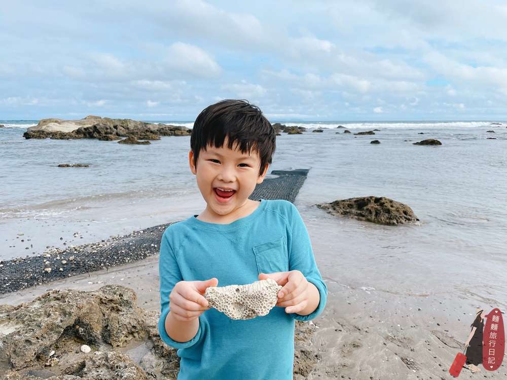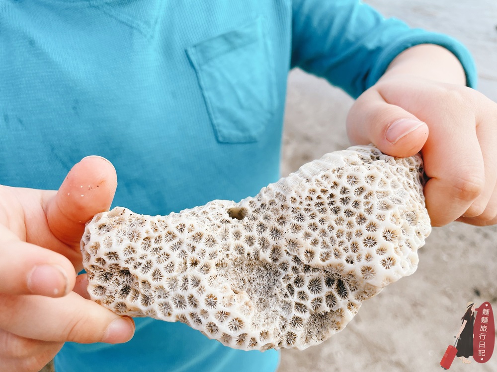 護魚區的沙子是白色的,非常細軟走在上面非常舒服呢!波仔又撿了顆珊瑚礁化石~小朋友在這裡根本像在挖寶藏一樣,走一走會發現有很多驚喜的發現!
