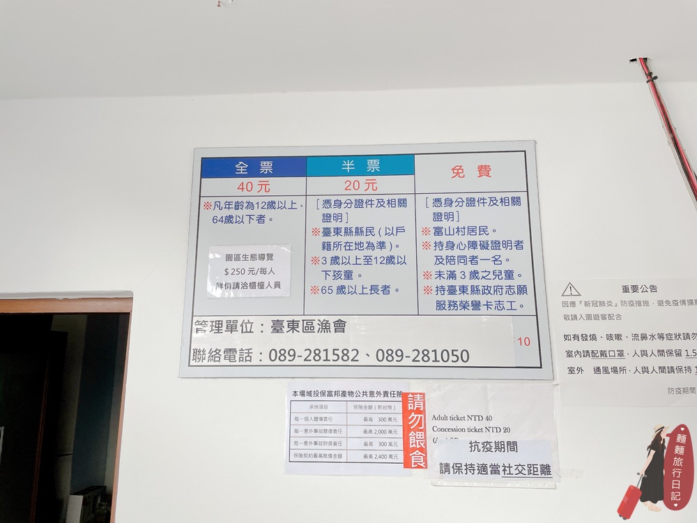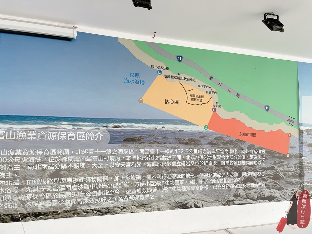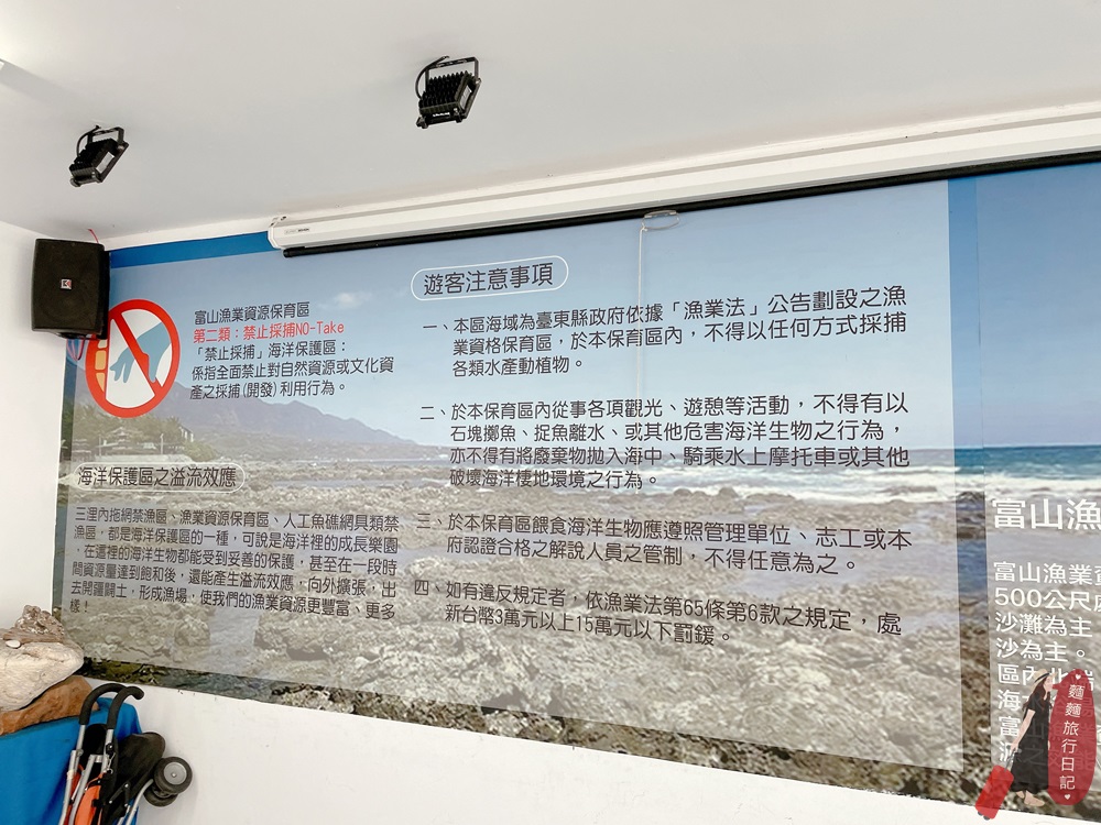 護魚區售票處有詳細的文字說明,有興趣的朋友們可以花點時間看一下護魚區的簡介喔!其實台東富山早期海域有非常豐富的海洋資源,但是人類的過度捕撈讓海洋生態被嚴重破壞,超級嚴重的!2005年起政府除了禁止捕撈外,富山護魚區也規劃了復育魚類、潮間帶!