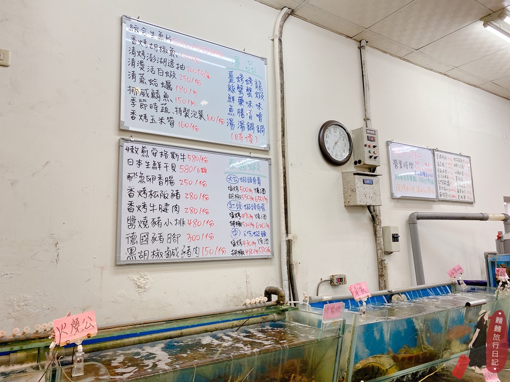 菜單寫在白板上,海鮮的價目表也寫在白板上,海鮮基本上都是時價,其他就看你想吃什麼海鮮到百寶箱裡請店員現撈。