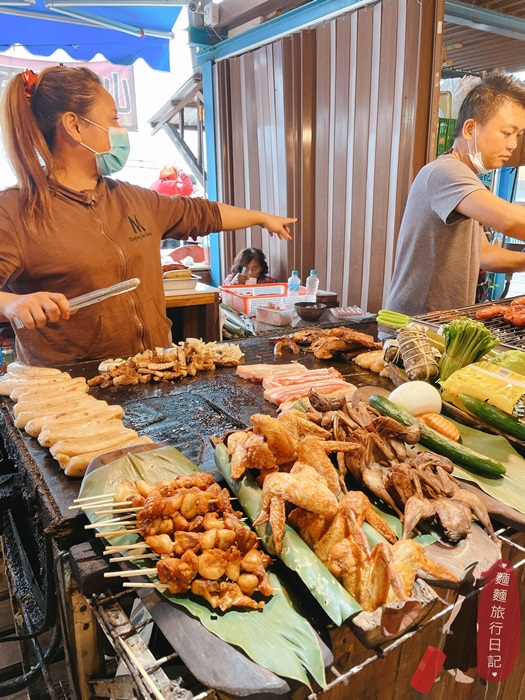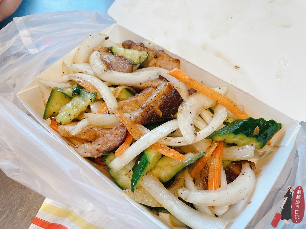 商店街裡叫賣聲絡繹不絕,超級熱鬧喧嘩,我們買了石板烤肉,烤肉還搭配蔬菜一起炒!