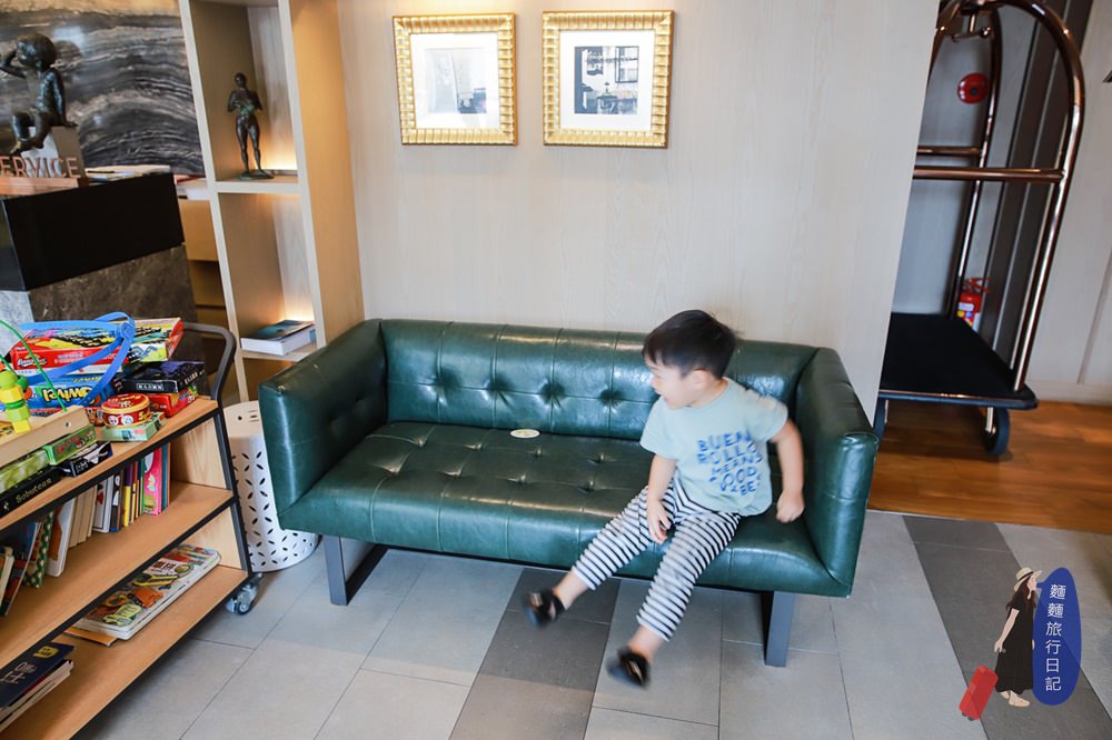 大廳靠近電梯有一個沙發區,有一個小推車裡裝著滿滿的童書跟繪本,還有桌遊~聽說這些是可以給小朋友帶回房間玩的。