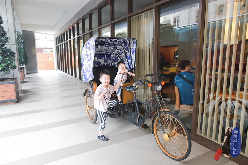 另外酒店門口有擺放一台復古三輪車,提供遊客拍照喔!波仔跟樂樂看到都興奮地爬上去,叫我幫他們拍照,哈哈哈~酒店有復古三輪車導覽活動可以預約登記。