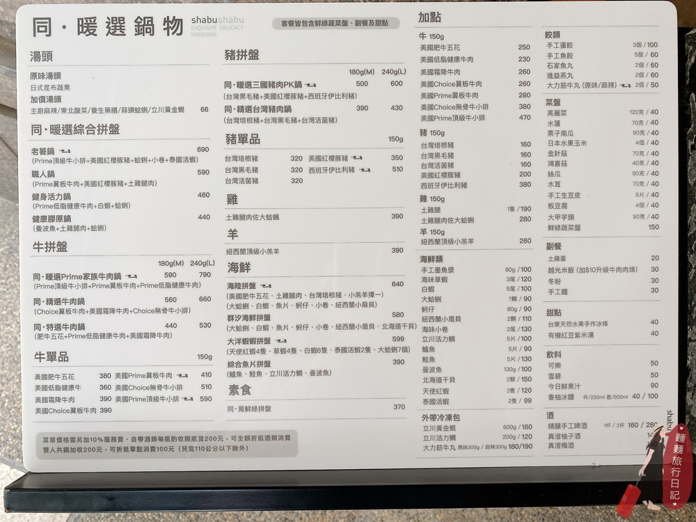 點菜方式就是單人份火鍋套餐,選湯底、主餐,只要點主餐都會附菜盤、副餐跟甜點。