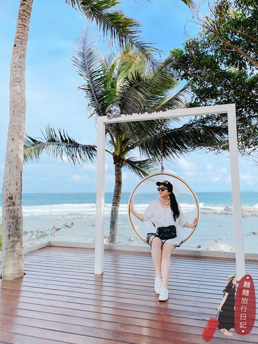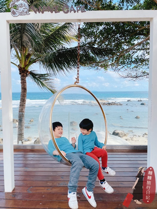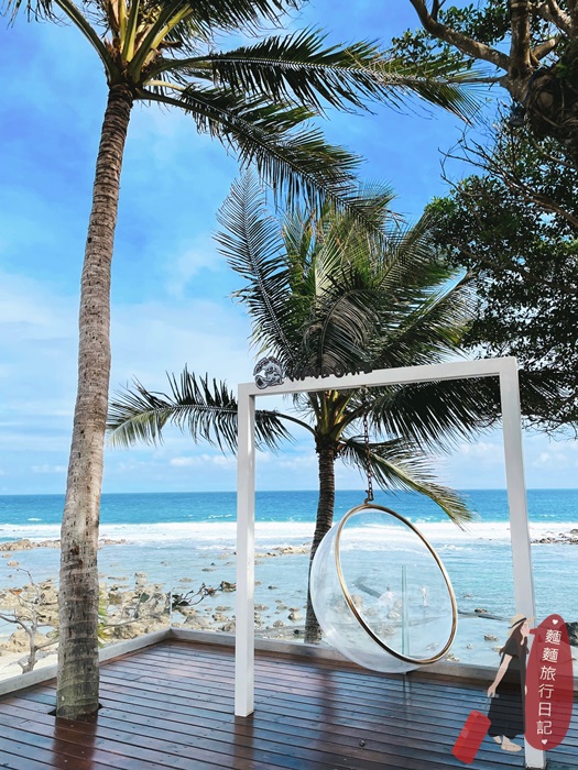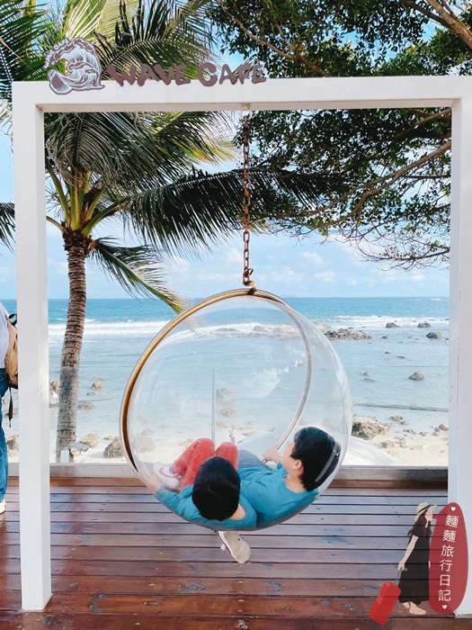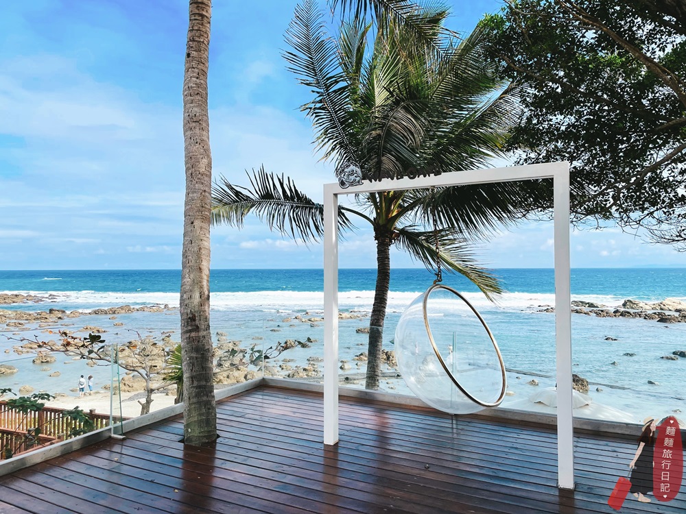 逐浪海景咖啡還有一個超級夢幻的透明盪鞦韆,透明鞦韆在2樓座位區旁的大露臺上,為了不遮蔽碧藍的大海,就連露臺上都是用透明的玻璃牆!